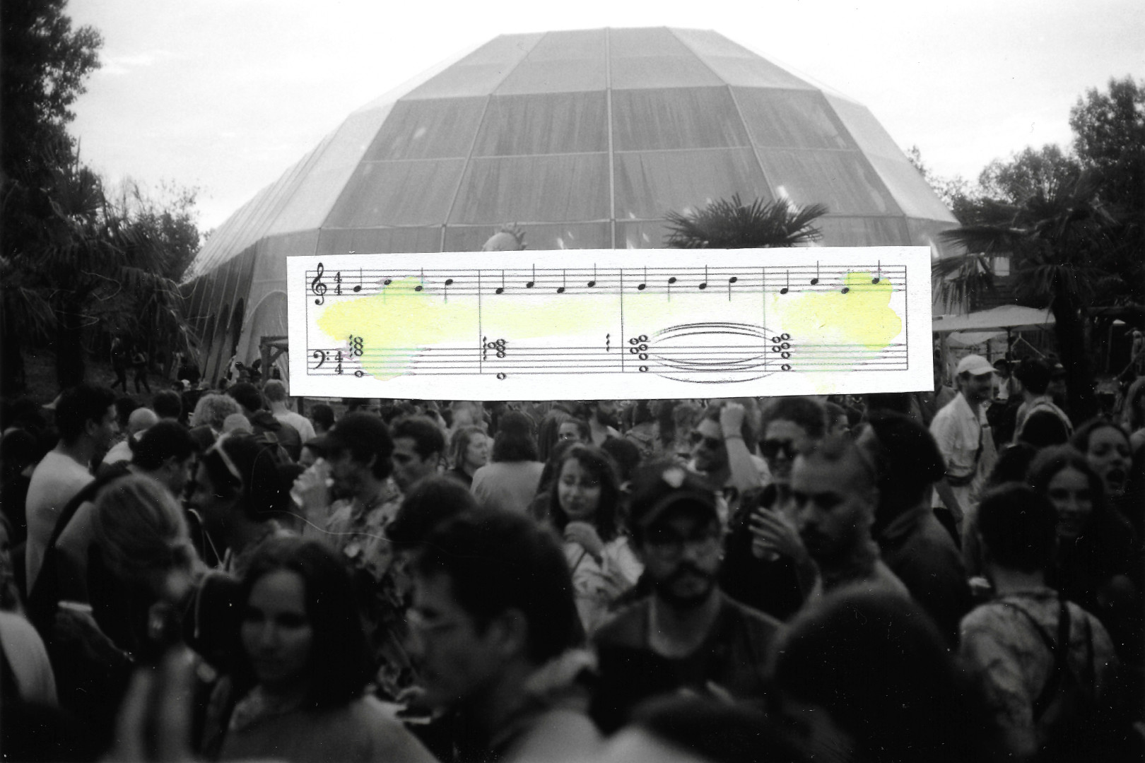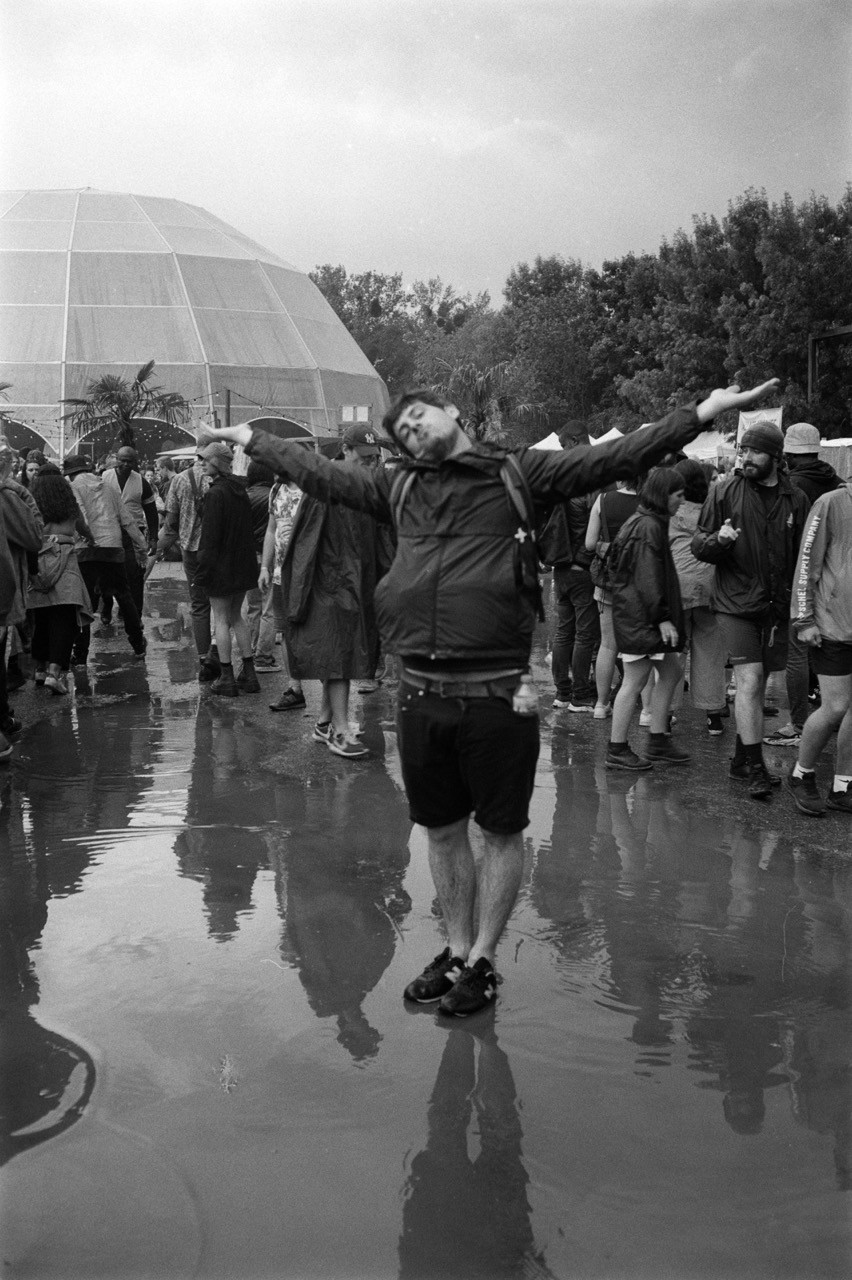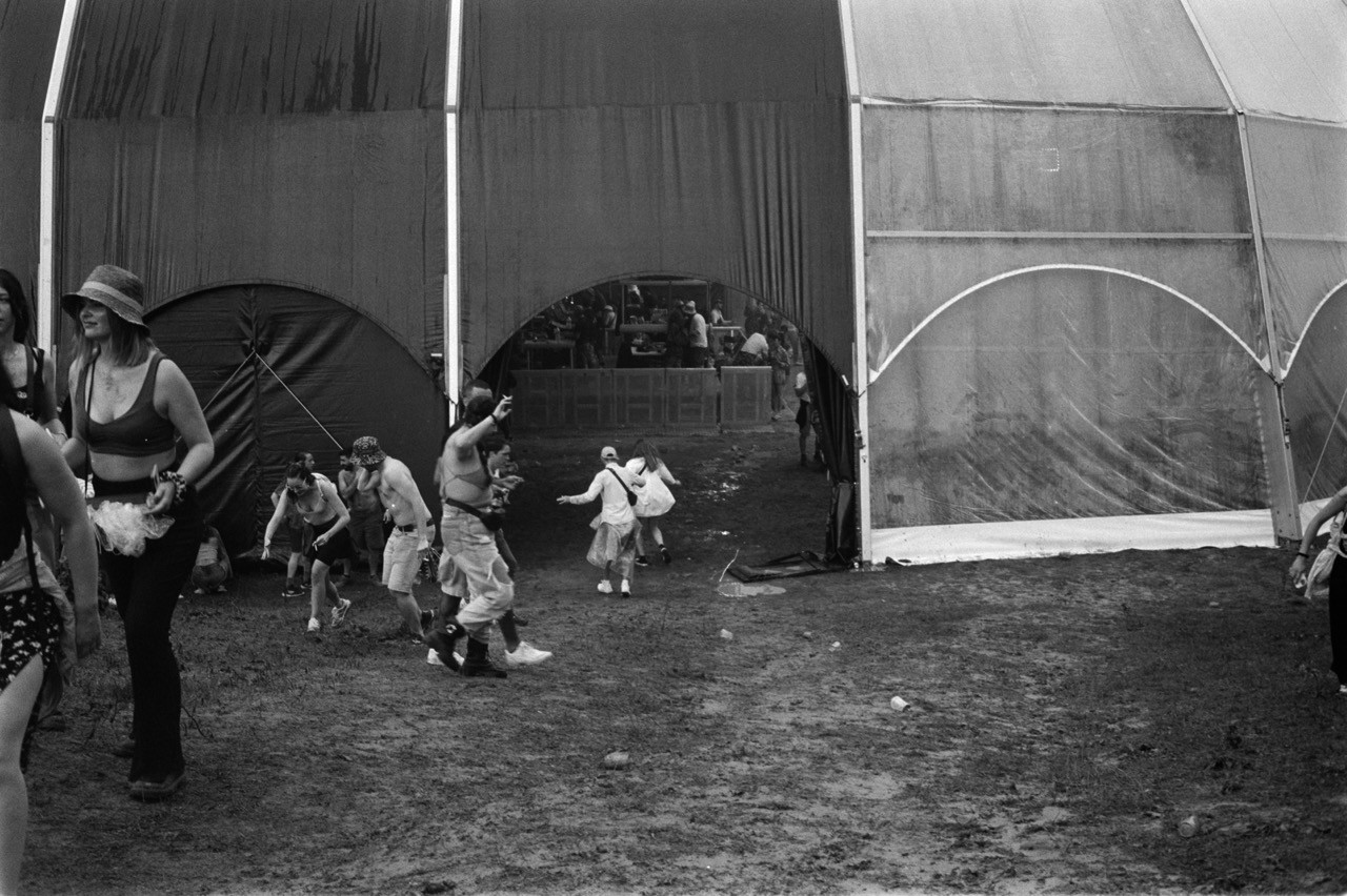 je suis pas hyper fan des festivals de techno — je m'y suis fait traîner. résultat : il s'est mis à pleuvoir et c'était joli. j'ai fait des collages.
